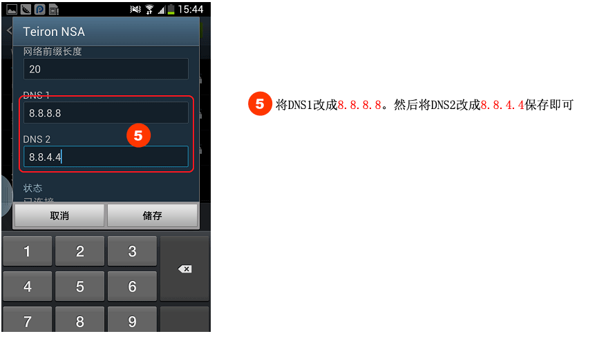 最后,我们只需要勾选上“手动设置DNS服务器”,然后填写DNS服务器为8.8.8.8,备用DNS服务器为8.8.4.4,完成后点击底部的保存按钮即可[如图]。